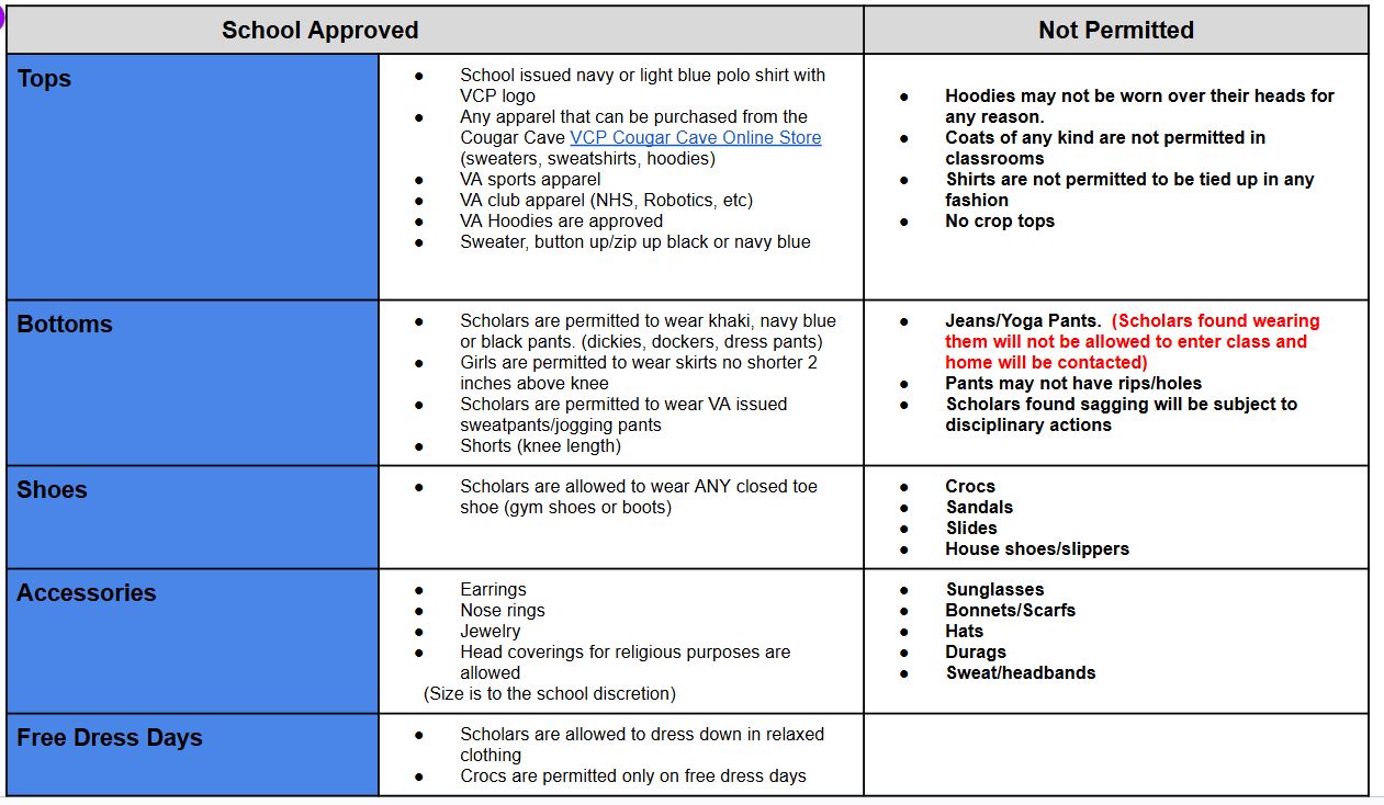 The dress code is strictly enforced. Warnings are not issued. The dress code is in effect anytime scholars are in the school building or on school-related functions such as field trips. Uniforms must be worn neatly and appropriately at all times.